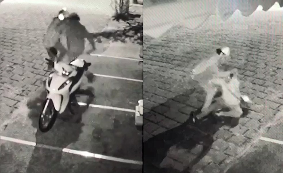 Nas imagens da câmera de segurança, é possível ver o momento em que a mulher desce da moto e um homem de boné se aproxima da vítima, tentando atingi-la com uma faca. A vítima cai no chão e o homem se ajoelha para esfaqueá-la.