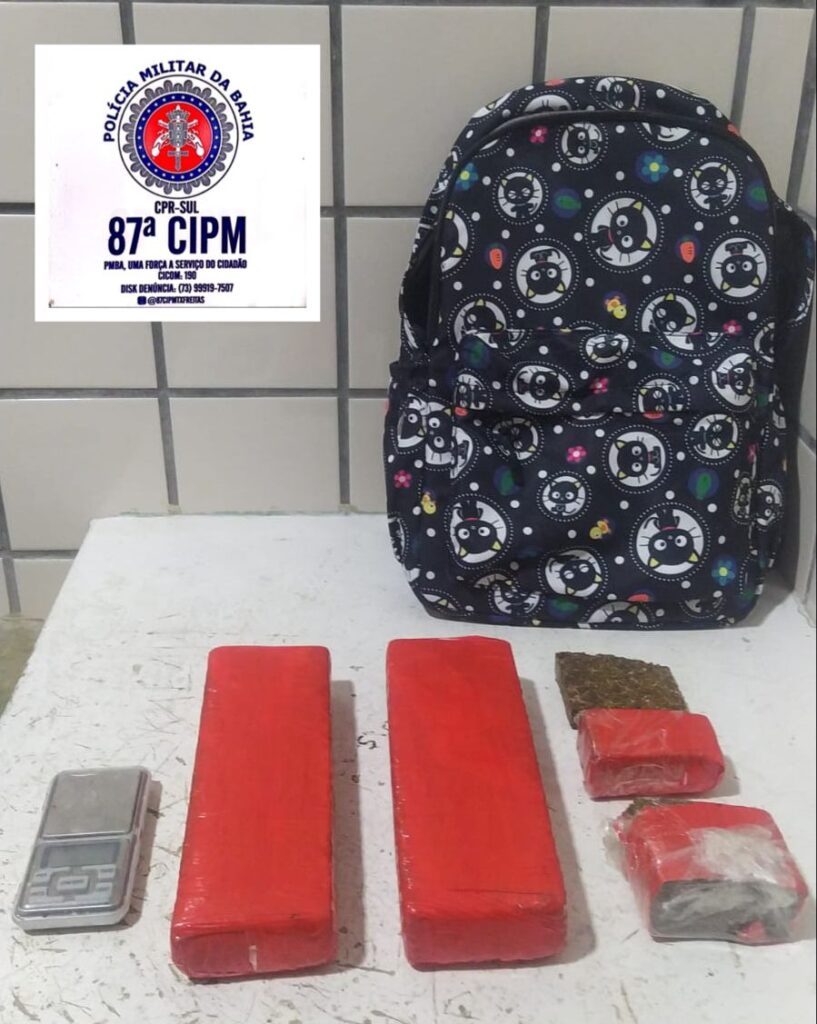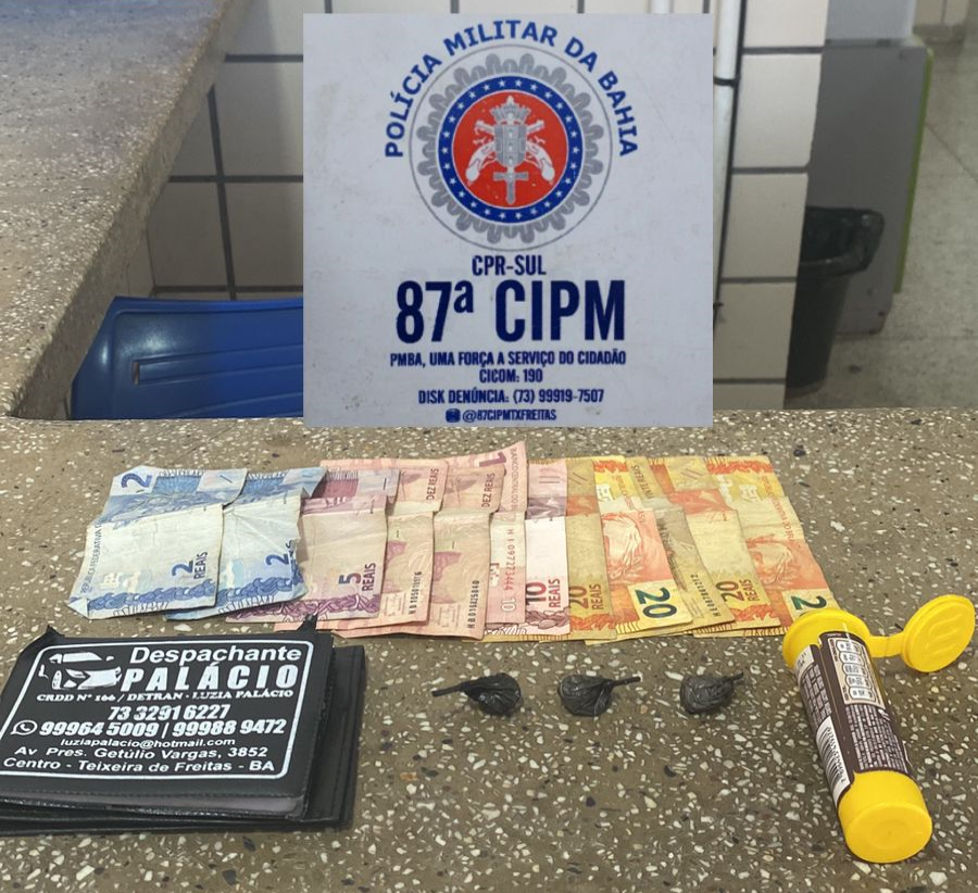 A Polícia Militar prendeu, no início da tarde desta quinta-feira (23), na cidade de Teixeira de Freitas, um homem com seis papelotes de maconha, pesando 85 gramas e R$ 1.792. Ele foi abordado por policiais da 87ª Companhia Independente de Polícia Militar na Rua da Penha, no Bairro São Lourenço. A droga e o dinheiro estavam em uma mochila. ASCOM 87ª CIPM