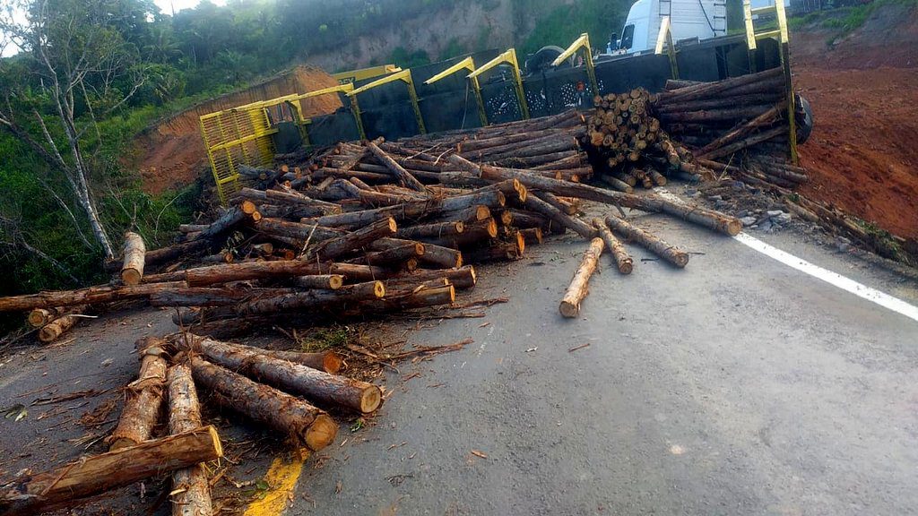Motoristas de veículos pesados que usam um desvio construído ao lado de uma cratera que se abriu na BR-101 continuam enfrentando sérios transtornos. Nos últimos dias, pelo menos três carretas tombaram no local, que fica perto da cidade de Itamaraju, no Extremo Sul baiano. Quando os acidentes acontecem, o fluxo no trecho é interrompido completamente, dificultando o transporte de cargas e o vai e vem de milhares de pessoas em uma das rodovias mais importantes do país. Na manhã desta quinta-feira (02.03), uma carreta com dois compartimentos tombou no desvio, espalhando toros de eucalipto pela pista. O motorista não ficou ferido. O trânsito só foi liberado por volta das 10h, quase quatro horas depois do tombamento. LADEIRAS ÍNGREMES E ESCORREGADIAS – Na maioria dos casos, os caminhoneiros atribuem os acidentes a duas ladeiras muito inclinadas, e com pavimentação de má qualidade, sem muita aderência, o que faz com que os veículos desçam de ré e acabem capotando ou tombando. PREVISÃO DE CONCLUSÃO DA OBRA – A reportagem do Radar entrou em contato com o Departamento Nacional de Infraestrutura de Transportes (Dnit), nesta quinta-feira, para obter um posicionamento sobre quando a obra de recuperação da pista original, levada pelas chuvas de dezembro, será concluída. O órgão respondeu que, devido à complexidade da intervenção, a previsão é que o trabalho seja finalizado no início do julho. Fonte: radar64