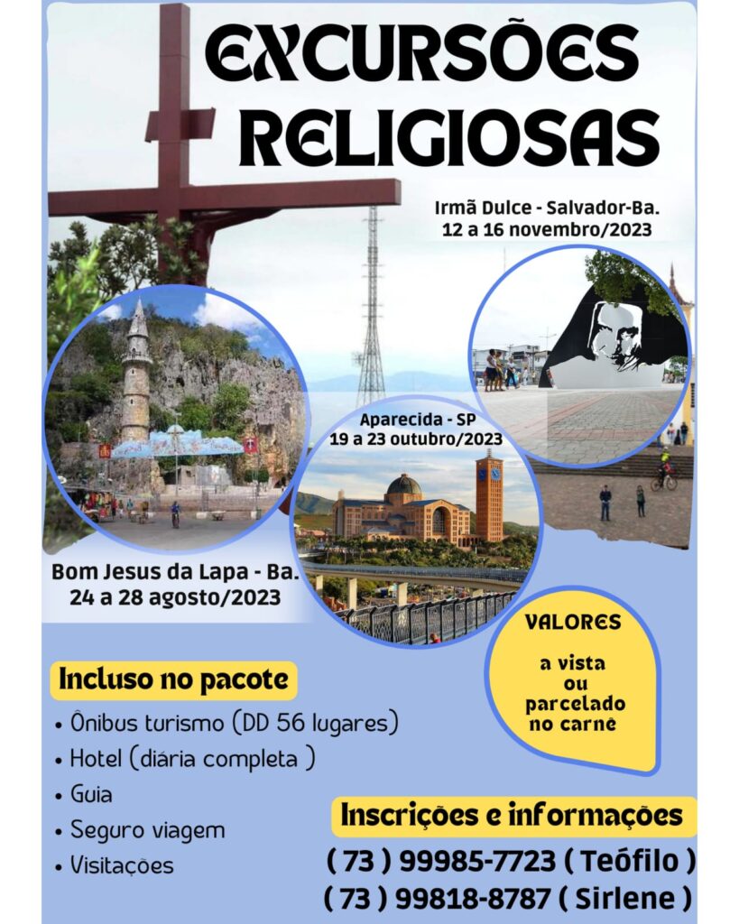 Franedir gois/OPovonews Bom Jesus da Lapa-BA: De 24 a 28/08/2023 Valor À Vista:R$ 1.410,00 ou 7x de R$ 205,00 Totalizando: R$ 1.435,00 Última Parcela em: 10/07/2023 Aparecida com Campos do Jordão/Frei Galvão/Canção Nova-SP: De 19 a 23/10/2023 Valor À Vista:R$ 1.550,00 ou 9x de R$ 175,00 Totalizando: R$ 1.575,00 Última Parcela em: 10/09/2023. Irmã Dulce dos Pobres- Salvador – BA: De 12 a 16/11/2023 Os Valores Serão Passados em Breve… Opções de Pagamento: A Vista, Pix, Depósito ou Transferência Bancária, Carnê e Cheque. Convidamos Você e Sua Familia para Nossas Excursões Religiosas!!! Se Possível, Repasse Para Parentes, Amigos e Conhecidos Que Apreciem Este Tipo de Turismo Religioso. Estaremos à disposição para maiores esclarecimentos Teófilo Coelho – (73)99985-7723 Sirlene – (73) 99818 8787.