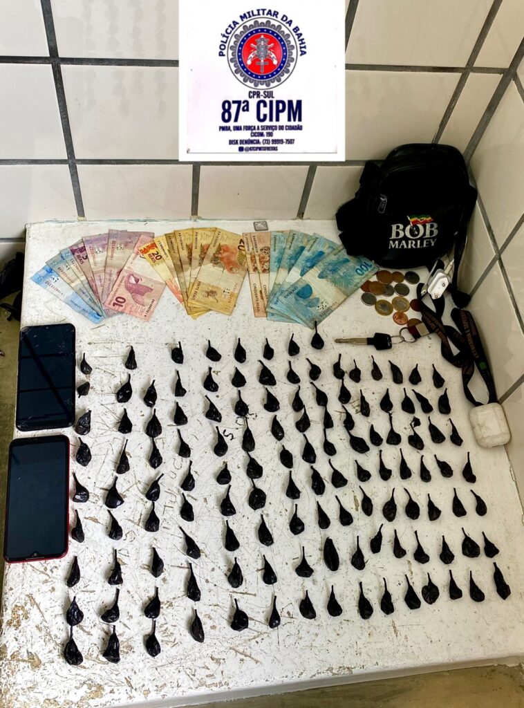 A Polícia Militar prendeu dois suspeitos na manhã deste sábado (28), na cidade de Teixeira de Freitas: um por tráfico de drogas e outro por roubo de celular. Às 11h45 um homem foi preso em flagrante na Rua Senhor José Silotte, no Bairro Vila Caraípe, com 124 papelotes de cocaína e R$ 663,60. Ele estava à bordo de uma motocicleta Honda Fan 150, cor preta, placa NYN1E10, com um suporte de entrega de lanches nas costas, quando foi abordado por uma guanição da 87ª Companhia Independente de Polícia Militar. A moto foi apreendida. Mais cedo, por volta das 9h, na Rua Nova Venécia, no Bairro Bonadiman, outra guarnição prendeu um homem que havia roubado um celular minutos antes em um estabelecimento comercial. Ascom 87ª CIPM