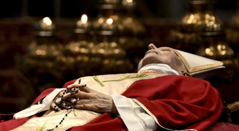 Papa Francisco comanda cerimônia fúnebre de seu antecessor; cerca de 130 mil fiéis lotam a praça São Pedro Bento XVI morreu na véspera de Ano Novo, aos 95 anos. O velório ocorreu na Basílica de São Pedro, no Vaticano, e terminou nesta quarta (4). O funeral acontece nesta quinta (5), na Praça São Pedro, em frente à basílica. A cerimônia começou às 5h30 (horário de Brasília) e é presidida pelo Papa Francisco. Veja detalhes. Cerca de 130 mil pessoas acompanham funeral no local. Após a homilia, o caixão com o corpo de Bento XVI é agora levado para dentro da Basílica de São Pedro, onde ocorrerá uma cerimônia privada. Bento XVI será enterrado sob a basílica, onde estão também os túmulos de outros papas. Em seguida, ele será colocado em um caixão de zinco, que será soldado. Depois será colocado em um terceiro caixão de madeira maior. Bento XVI será enterrado de acordo com seus desejos no mesmo local nas criptas sob a Basílica de São Pedro, onde o Papa João Paulo II foi originalmente enterrado em 2005, antes de seu corpo ser realocado para uma capela na basílica em 2011. A praça de São Pedro, no Vaticano, está quase totalmente ocupada. Um público de cerca de 130 mil, entre membros da igreja católica, fieis, representantes de governos, jornalistas e turistas, acompanham o funeral de Bento XVI. Também está presente um forte esquema de segurança, com milhares de policiais. Francisco pede que Bento seja ‘bem recebido por Deus’ Nas primeiras palavras no funeral de Bento XVI, o papa Francisco, que preside a cerimônia, pediu que seu antecessor “seja bem recebido por Deus”. “Bento, que sua alegria seja completa ao ouvir Sua voz, agora e para sempre”.