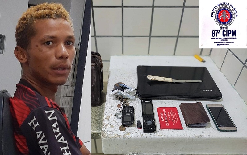 Teixeira de Freitas: Júlio Cláudio Martins Angélica, de 21 anos, foi preso na noite deste domingo, 1º de janeiro, por volta das 22h25, na Rua Espanha, no Bairro Jardim Europa, em Teixeira de Freitas, após duas tentativas de furto. Informações dão conta que um suspeito teria tentado roubar um veículo Peugeot, de cor vinho, placa não divulgada. Como não conseguiu a investida, ele furtou diversos pertences da vítima, sendo 01 bolsa, 01 notebook, documentos pessoais do veículo, e outros pertences pessoais. Na sequência, após esse furto, o suspeito, tentou mais uma vez furtar outro veículo, sendo um Fiat/Uno Mille Fire, de cor azul, ano 2006, placa policial MQX-3645, licenciado em Itamaraju-BA, momento que foi visto pelo dono do veículo tentando fazer uma ligação direta, e foi dominado pelo proprietário e um amigo que deu suporte na ação. A Polícia Militar foi informada, atendeu a ocorrência, e ao chegar no local, o Júlio recebeu voz de prisão. Com ele foi encontrada uma arma branca (tipo faca) na cintura, e diversos produtos furtados no primeiro veículo. O suspeito foi conduzido e apresentado na Delegacia Territorial de Teixeira de Freitas. Após oitiva, o delegado plantonista, Manoel Andreetta, flagrantou o Júlio Cláudio, por furto qualificado (Art. 155 do CPB). Júlio Cláudio permanece preso na custódia da Polícia Civil de Teixeira de Freitas, à disposição da Justiça. Fonte: LN