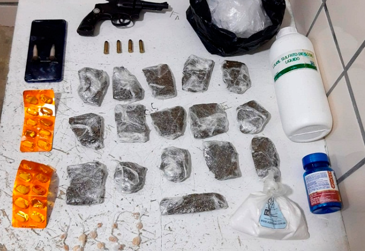 Teixeira de Freitas: Policiais militares CIPE Mata Atlântica aprenderam na noite desta quinta-feira, 10 de novembro, arma e drogas, em ação no Bairro São Lourenço. Segundo os militares, a guarnição realizava rondas pelo Bairro São Lourenço, quando visualizou um indivíduo na Rua Dom Antônio, encostado em uma motocicleta Honda Bros. A PM tinha informações que estava havendo altos índices de assaltos naquela região, realizados por um indivíduo a bordo de uma motocicleta com as mesmas características. Ainda segundo a Polícia, havia a informação de que uma moto Honda Bros havia sido roubada, nesta quinta-feira. Por este motivo, os policiais abordaram o suspeito, e realizaram uma busca pessoal, mas nada de ilícito foi encontrado com ele. Após consulta da placa da motociclista no Sistema, os militares identificaram que o veículo estava legal, porém, de acordo com os policiais, o suspeito apresentava um forte odor de maconha e por isso foi questionado sobre os entorpecentes, foi quando ele disse ter drogas em casa e que o cheiro era porque ele estava cortando o entorpecente. Os policiais foram até a residência do suspeito, e ele entregou a droga e uma arma de fogo que estavam guardada em seu quarto. Ao todos, os militares apreenderam alguns pedaços de erva prensada, análoga à maconha, pesando aproximadamente 240 gramas; 02 pinos contendo um pó branco, aparentando ser cocaína, pesando aproximadamente 2 gramas e pedras análogas ao crack, pesando aproximadamente 5 gramas; 1 litro de sulfato de sódio; 250 gramas de um pó branco, que aparenta ser ácido bórico. Os militares apreenderam ainda alguns comprimidos de Paracetamol e Cafeína (produtos utilizados para multiplicar as drogas) e 01 arma de fogo marca Taurus. calibre 32, n° 497974; 04 munições intactas de mesmo calibre; 01 aparelho celular samsung, de cor azul. O material é o suspeito foram apresentados na Delegacia de Teixeira, ao delegado plantonista, Manoel Andreetta. Após oitiva, o suspeito foi liberado para responder em liberdade. Segundo apurou nossa reportagem, o suspeito foi liberado, pois no momento da abordagem nada de ilícito foi encontrado com ele. A apreensão dos materiais (arma e drogas) foram na residência do suspeito, sem um mandado de busca. Um inquérito regular foi instaurado e o suspeito será investigado. Fonte: LN