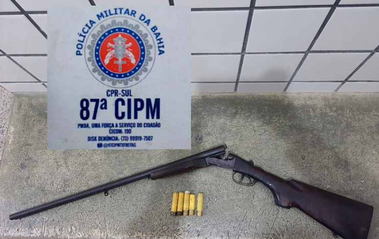 Teixeira de Freitas: A Polícia Militar apreendeu, na noite deste sábado (17), uma espingarda calibre. 20 numa vicinal, próximo ao distrito de Duque de Caxias, município de Teixeira de Freitas. Uma guarnição da 87ª Companhia Independente de Polícia Militar avistou um suspeito que, ao notar a aproximação da PM, dispensou a arma e fugiu na escuridão para um matagal. A espingarda de dois canos, da marca Rossi e cinco cartuchos, um dos quais deflagrado, foram apresentados na delegacia de Teixeira de Freitas. Fonte: LN/Ascom