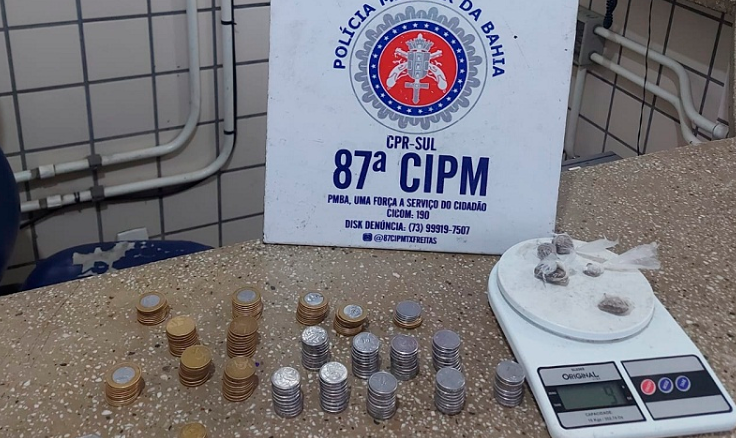Teixeira de Freitas: A apreensão aconteceu na tarde deste domingo, 31 de julho, na Rua Jardim Botânico, no Bairro Tancredo Neves, na cidade de Teixeira de Freitas, quando policiais militares, em rondas ostensivas, apreenderam 05 (cinco) buchas de maconha; 01 balança de precisão; (digital) e a quantia de R$ 112,85 ( cento e doze reais e oitenta e cinco centavos). A droga estava em uma sacola, que foi deixada por um suspeito, que ao ver a aproximação da PM, saltou um muro e empreendeu fuga, tomando rumo ignorado. O material apreendido foi apresentado na Delegacia Territorial de Teixeira de Freitas, no plantão do delegado titular, Ricardo Amaral, para medidas as medidas cabíveis. Fonte: LN