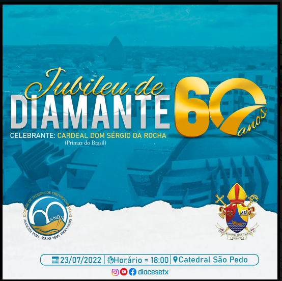 A Diocese de Teixeira de Freitas – Caravelas completa convida você e sua família para celebrarmos juntos o Jubileu de Diamante da nossa diocese. A Celebração Eucarística será no dia 23 de Julho de 2022, na Catedral Diocesana São Pedro na cidade de Teixeira de Freitas, às 18:00, com a presença do Cardeal Dom Sérgio da Rocha, Arcebispo da Arquidiocese de São Salvador e Primaz do Brasil.