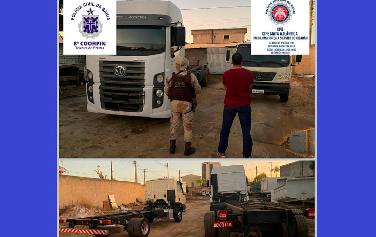 Teixeira de Freitas: A Operação conjunta da CAEMA e Polícia Civil de Teixeira de Freitas aconteceu na noite da última quarta-feira, 13 de julho, por volta das 19h00, na cidade de Teixeira de Freitas, após denúncias de que havia um local de desmanche e receptação de caminhões roubados/furtados oriundos do estado do Espírito Santo. Duas guarnições da Polícia Militar (CIPE/Mata Atlântica) e da Policia Civil deslocaram até o referido endereço para averiguar os fatos. No local indicado, as equipes visualizaram um veículo WG/30-330 CRC 8×2, de placa RBG-9G87, roubado na cidade de Vila Velha/ES, deflagrando a ação das forças de segurança. Na ação, foram recuperados 02 (dois) caminhões que estavam com placas divergentes dos números dos chassis. No local foi encontrada uma cabine, um muck, uma carroceria e diversas peças de um caminhão VW 24280, de placa policial ODP-4731, furtado em 19/06/22, no Espírito Santo. O proprietário da oficina não foi encontrado, e um suspeito, de 43 anos, afirmou ter comprado peças dos caminhões irregulares, momento em que recebeu voz de prisão, sendo conduzido e apresentado na Delegacia Territorial de Teixeira de Freitas para averiguação. Na sequência, os policiais receberam informações de que dois caminhões de uma empresa que comercializa frutas foram roubados/furtados no ES e clonados. Um deles, de placa LPT-6703 foi localizado, abandonado em um posto de combustível na cidade de Teixeira de Freitas. Diante dos fatos, toda a materialidade foi apresentada, juntamente com o suspeito. As equipes estão em diligências na tentativa de prender outros suspeitos e recuperar outros veículos. Fonte: LN