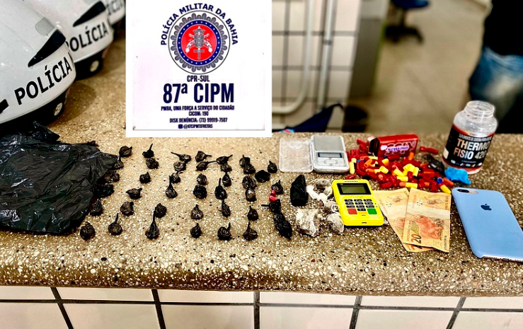 Teixeira de Freitas: O fato aconteceu na manhã desta segunda-feira, 11 de julho, por volta das das 12h00, na Urbis I, na cidade de Teixeira de Freitas. De acordo com as informações, policiais militares da Companha Independente de Polícia Militar (CIPM), em rondas ostensivas, abordaram e prenderam um suspeito de envolvimento com o tráfico de drogas. O suspeito estava em uma motocicleta Honda CG FAN 150, de cor vermelha. No momento em que viu os policiais militares, o suspeito ainda tentou fugir, mas, foi alcançado e preso. Trata-se de Marcos Felipe Soares Fernandes, de 19 anos, que foi conduzido e apresentado na Delegacia Territorial de Teixeira de Freitas. Com o Marcos Felipe, os militares encontraram 41 (quarenta e um) pinos de cocaína; 02 (duas) porções e mais 05 (cinco) buchas de maconha; uma balança de precisão, uma máquina de cartão de crédito, e a quantia de R$ 40,00, (quarenta reais). Após oitiva o delegado plantonista, Ricardo Amaral, flagranteou o Marcos Felipe, pelo crime de tráfico de drogas (Art. 33 do CPB). Marcos segue preso na custódia da Polícia Civil de Teixeira de Freitas, à disposição da Justiça. Fonte: LN