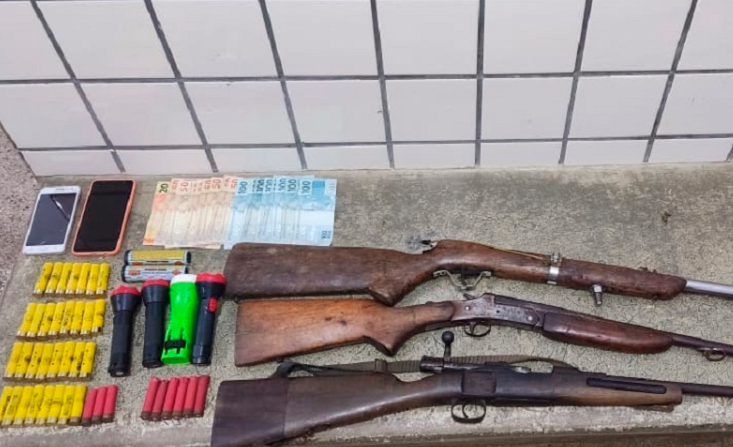 Nova Viçosa: A apreensão aconteceu na tarde do último domingo, 12 de junho, por volta das 17h00, no distrito de Helvécia, no município de Nova Viçosa, quando policiais militares da CIPE Mata Atlântica (CAEMA) realizavam o policiamento ostensivo através de rondas rurais, pela BR 418 sentido a Juerana, momento em que avistaram um motorista em atitude suspeita. Os militares deram voz de abordagem ao condutor do veículo Fiat Strada CD, e realizaram uma busca pessoal, em 03 (três) ocupantes do veículo, encontrado no interior do automóvel, várias armas. Diante dos fatos, foi dada voz de prisão aos indivíduos pelo crime de porte ilegal de arma de fogo. Na sequência, o trio foi conduzido e apresentado na Delegacia Territorial de Teixeira de Freitas. Foram apreendidos 01 Espingarda calibre 32, marca-Rossi com numeração 9603; 01 Carabina calibre 28, marca Imbel, com numeração 5888; 01 Espingarda de fabricação artesanal, sem numeração; 32 (trinta e duas) munições calibre 28 intactas; 03 (três) munições calibre 32; 06 (seis) munições deflagradas calibre 32; 04 (quatro) lanternas; 02 (dois) vasilhames de pólvoras; 02 aparelhos celular da marca Samsung e R$ 1.220,00 (hum mil duzentos e vinte reais) em especie. O veículo Fiat Strada CD, de cor prata, placa policial PRE-5743, licenciado em Rubiataba-GO, também foi apreendido. Após oitiva, o delegado plantonista, Bruno Ferrari, flagranteou o trio por porte ilegal de arma de fogo e arbitrou fiança aos três indivíduos, ficando eles à disposição da Polícia Judiciária. Após o pagamento da fiança irão responder ao crime em liberdade. Fonte: LN