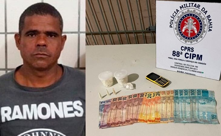 Alcobaça: A prisão aconteceu na tarde do último sábado, por volta da 16h00, em via pública, na Rua da Paz, no Bairro da Subestação, na cidade de Alcobaça-BA. O suspeito foi identificado como sendo o pescador, Jamilson Mendes da Silva, 47 anos, vulgo “Juruna”. Segundo a PM, a prisão se deu após denúncia anônima de que indivíduos estariam traficando em uma casa, próximo à subestação de energia. Os policiais militares da 88ª, em rondas ostensivas, foram à localidade informada, chamaram na porta, se identificando como policiais, e após um morador abrir a porta, este informou aos militares, que a pessoa de vulgo “Juruna” teria pulado o muro para uma área de matagal, e estaria de posse de uma arma de fogo e drogas. Na sequência, o suspeito foi detido nos fundos da residência. Com ele, os militares encontraram 80g de cocaína, a quantia de R$ 797,00, (setecentos e noventa e sete reais) em espécie, e 01 aparelho celular da marca JLUA. O Jamilson recebeu voz de prisão e foi conduzido para a Delegacia Territorial de Teixeira de Freitas. Após oitiva, o delegado plantonista, Manoel Andreetta, flagranteou o Jamilson Mendes, pelo crime de tráfico de drogas, (Art. 33). Jamilson segue preso na custódia da Policia Civil, à disposição da Justiça. Fonte: LN