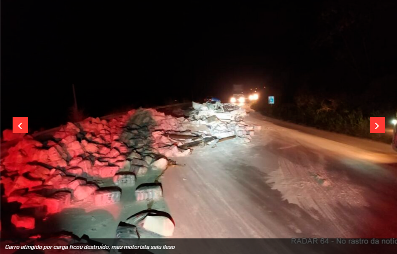 O motorista saiu ileso após o carro em que ele estava ser atingido por uma carga transportada por um caminhão. O acidente aconteceu por volta das 20h40 de quarta-feira (08), na BR-101, a cerca de 17 quilômetros do centro de Eunápolis. O caminhão carregado de farinha de trigo seguia em direção a Feira de Santana, quando, em uma curva, colidiu lateralmente com uma picape, que vinha em sentido contrário. Atingida por fardos de farinha de trigo, a picape ficou completamente destruída, mas o motorista, de 40 anos, conseguiu sair das ferragens, com poucas escoriações. O caminhoneiro, de 39, também não ficou ferido. O trânsito no trecho do distrito de Mundo Novo, local do acidente, ficou bloqueado por cerca de quatro horas, até que os veículos e o produto fossem removidos da pista. Parte da carga foi saqueada. Fonte: Radar 64