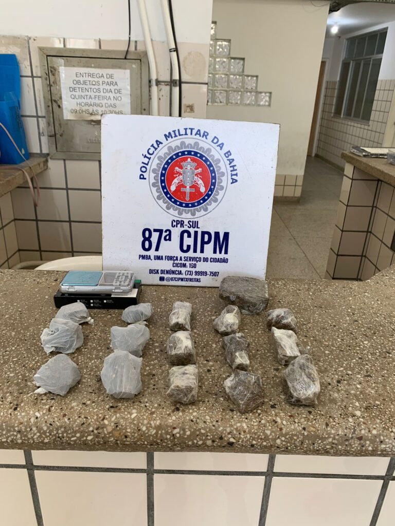 A Polícia Militar prendeu, na manhã desta quarta-feira (11), na região central da cidade de Teixeira de Freitas, um homem suspeito de tráfico de drogas. Ele estava com 15 tabletes de maconha e uma barra da mesma droga, num total de 438 gramas. O suspeito foi abordado por uma guarnição da 87ª Companhia Independente de Polícia Militar, por volta das 9h, quando transitava pela Rua Joaquim Muniz Neto. A droga e uma balança de precisão, utilizada para pesar entorpecente, estavam em uma sacola plástica, que o suspeito tentou se desfazer, jogando na via pública, antes de, sem êxito, tentar fugir. Ascom 87ª CIPM