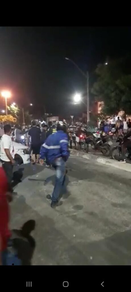O Trânsito de Teixeira de Freitas é uma bomba pronta para explodir a qualquer momento. Um vídeo enviado à nossa equipe de reportagem mostra o momento exato em que, Ráunis Carlos Santos, 31 anos de idade, consegue fugir do linchamento, mas é alvejado. Pelo menos 6 tiros foram desferidos contra Raunis. O atirador no momento do homicídio vestia uma jaqueta azul com uma listra branca separando a parte superior da inferior, como é possível ver na foto em destaque. A família pede ajuda da comunidade para identificar o autor dos disparos. A revolta e a tentativa de linchamento aconteceu após o Servidor Público ter atropelado duas pessoas que estavam transitando em uma motocicleta, por volta das 21h, deste sábado, 16 de abril na Av. Getúlio Vargas, em Teixeira de Freitas. Ele conduzia um veículo VW Gol Special, de cor branca, placa PPM-3H46. O fato: Raunís perdeu o controle do veículo e tombou, ainda na avenida. À princípio ele foi socorrido por populares no entanto a população foi informada que ele atropelou os irmãos, Nicolas Oliveira Carvalho, 25 anos, e seu irmão menor, Natan Oliveira de Carvalho, de 13 anos e fugiu em alta velocidade para não prestar socorro. Diante dessa nova informação a população presente se revoltou e algumas pessoas começaram a agredir o servidor. Ráunis foi socorrido ao HMTF, indo direto para o Centro Cirúrgico, mas não resistiu aos ferimentos e veio a óbito. Durante a ação, o mototaxista identificado por Elton Bruno da Costa foi atingido em uma das mãos e o senhor Anito Etelvino Lúcio, de 64 anos, que passava pelo local, acabou sendo atingido na garganta. Segundo informações, o estado de saúde do senhor Anito é delicado. Os irmãos, que são filhos do senhor José Carlos, presidente do SINDEC, também foram socorridos pelo SAMU ao Hospital Municipal, o Natan com uma fratura na perna. Não há informações sobre o estado de saúde do Nicolas.