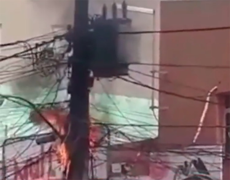 Fiação de poste pega fogo e causa apreensão no centro de Eunápolis