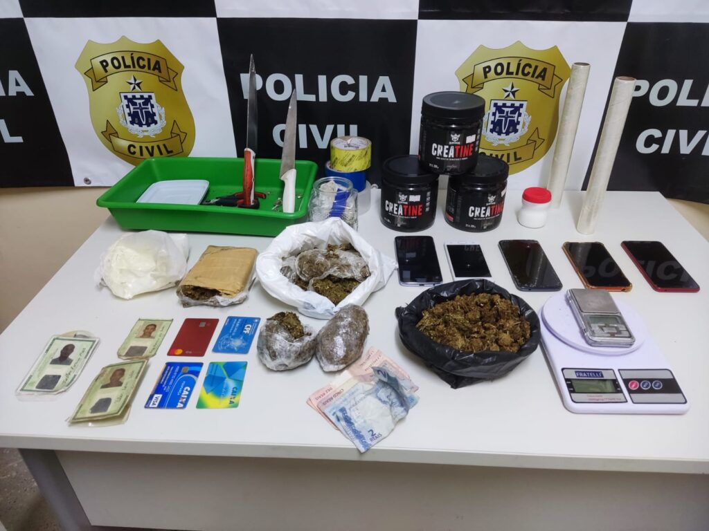 Um trio envolvido com o tráfico de drogas no bairro São Pedro, em Itabuna, foi preso na quinta-feira (24), por policiais da Delegacia de Tóxicos e Entorpecentes (DTE), após receberem informações de venda de entorpecentes na localidade. Com eles foram encontradas porções de maconha e cocaína. “Policiais da DTE, da Delegacia de Homicídios e da 2ª Delegacia Territorial realizaram incursões na localidade e avistaram os homens correndo com a chegada das viaturas. Os policiais fizeram o cerco e conseguiram encontrar e prender em flagrante os três”, explicou o titular da DTE, delegado Fábio José Vieira Simões. Foram encontrados porções de cocaína e maconha, duas balanças, cinco aparelhos celulares, embalagens para acondicionar as drogas e duas facas. “Vale ressaltar que todos os envolvidos já foram presos anteriormente pelo crime de tráfico de drogas e porte ilegal de armas de fogo”, disse o delegado. O trio foi encaminhado para a DTE, onde foi ouvido e levado para o Departamento de Perícia Técnica (DPT), onde passou por exames de corpo de delito e segue custodiados no aguardo da audiência de custódia. Fonte: Ascom PC