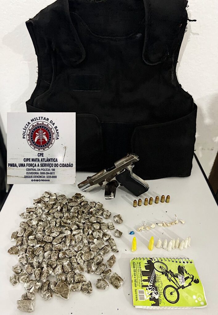 Policiais militares da Companhia Independente de Policiamento Especializado (Cipe) Mata Atlântica prenderam dois homens e apreenderam com eles uma arma de fogo e munições em Trancoso, por volta das 17h de domingo (20). A guarnição realizava rondas quando reconheceu um criminoso que trocou tiros com policiais militares no bairro Maria Viúva no dia anterior. Durante a abordagem, o homem confessou a participação no crime e indicou onde estava o armamento e munições utilizados. Guarnições da Cipe Mata Atlântica e da Companhia de Emprego Tático Operacional (Ceto) do 8º Batalhão se dirigiram até as proximidades do local confronto e localizaram, além da pistola e munições, 150 porções de maconha, 11 pedras de crack, 10 porções de cocaína, um colete balístico e uma caderneta com anotações do tráfico. Além do detido, outro suspeito foi localizado e encaminhado para a delegacia, juntamente com todo o material apreendido. Fonte: DCS | PM