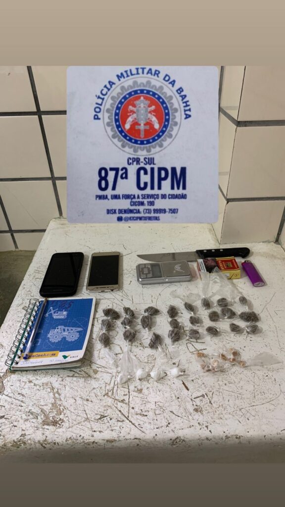 Uma ação da 87ª Companhia Independente de Polícia Militar (CIPM) resultou na condução de dois indivíduos e na apreensão de substâncias entorpecentes e outros objetos ilícitos, na tarde desta terça-feira (29). A abordagem foi na Rua Senador Queiroz, localizada no bairro Bela Vista, na cidade de Teixeira de Freitas Durante a busca, os policiais apreenderam 24 papelotes de maconha, com um peso total de 34 gramas; quatro papelotes de cocaína, pesando quatro gramas e nove pedras de crack, totalizando três gramas. Os agentes apreenderam ainda com os suspeitos uma balança digital, utilizada para a pesagem das drogas, dois celulares da marca Samsung, uma faca e um caderno de anotações. Os suspeitos, um homem de 20 anos e um adolescente de apenas 17 anos, foram conduzidos à Delegacia de Teixeira de Freitas. PMBA, uma Força a serviço do cidadão! Ascom 87ª CIPM Fonte: Agência Senado