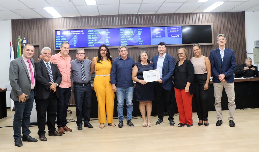 A Câmara Municipal de Teixeira de Freitas, no uso de suas atribuições legais confere MOÇÃO DE CONGRATULAÇÃO a servidora EURIDES DOS SANTOS SOUZA, ela que jubilosamente tem realizado um trabalho edificante, além de um exemplo de profissional dedicada e prestativa ao longo de mais de 22 anos. Na solenidade a servidora teve o privilégio de estar ao lado dos diversos presidentes que conduziram a Casa, ao longo de sua jornada de trabalho. Aqueles presidentes que já partiram para junto de Deus (Genivaldo Bispo e Luiz Henrique – LULA) foram representados por suas esposas. Na foto vemos: Da direira para esquerda: Marcos Belitardo, Suely (esposa de Lula), Lurdes (esposa de Genivaldo Bispo), Bruno Barbosa (vereador que concedeu a moção), Eurides (homenageada), Agnaldo da Saúde, Marta Helena, Mendes, Caio Checon, Ronaldo Cordeiro e Tequinha, atual presidente da Casa. Veja o vídeo com Eurides, a homenageada: