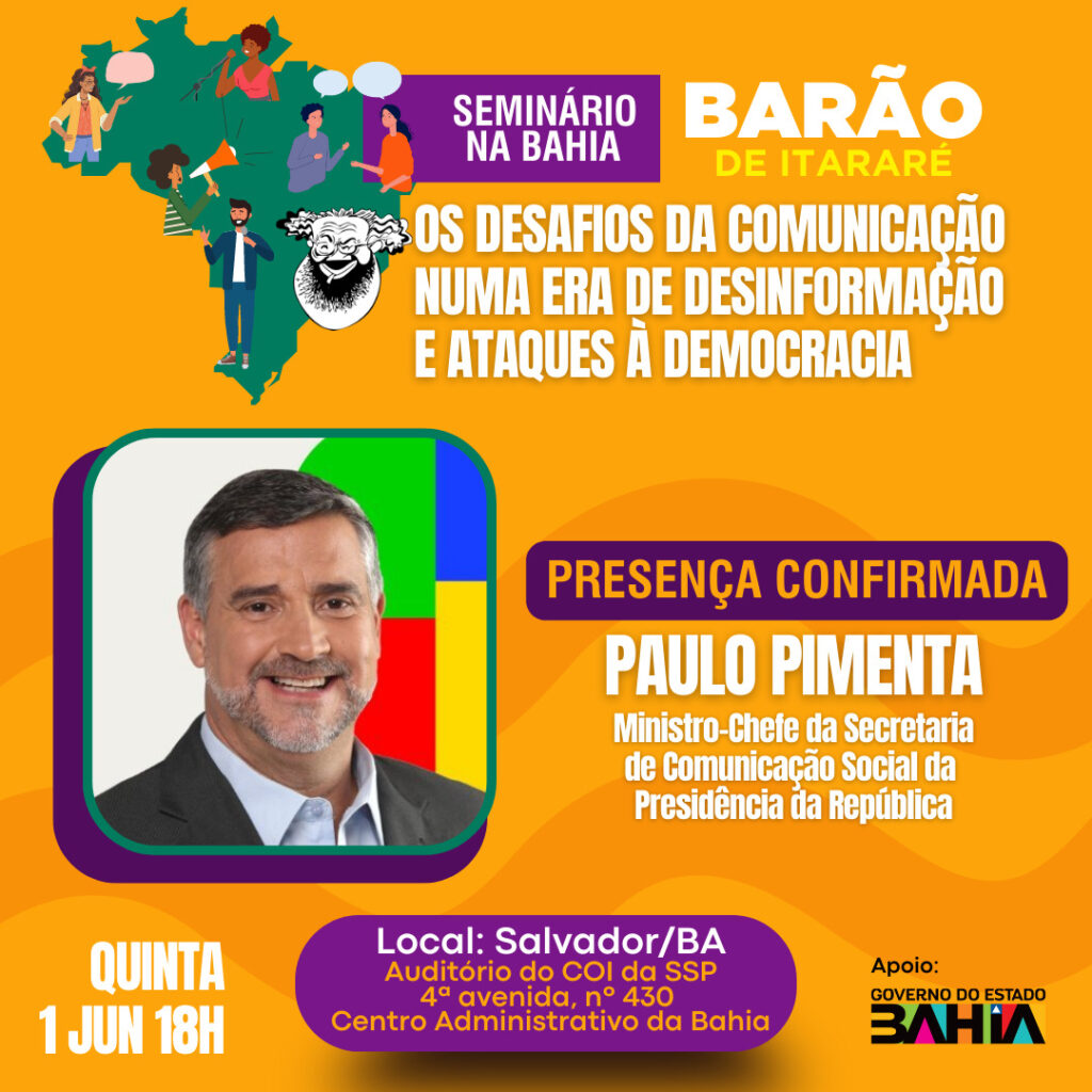 O seminário ‘Os desafios da comunicação numa era de desinformação e ataques à democracia’ reunirá profissionais da Comunicação, pesquisadores e autoridades, nas próximas quinta e sexta-feira (1 e 2 de junho), em Salvador, com objetivo de discutir experiências e estratégias para uma mídia mais diversa e plural. Promovido pelo Centro de Estudos da Mídia Alternativa Barão de Itararé, com apoio do Governo do Estado, o encontro acontece no auditório do Centro de Operações e Inteligência (COI) da SSP, no Centro Administrativo. Aberto ao público, o evento é realizado após quatro anos de escalada da violência contra jornalistas e de ataques à liberdade de imprensa e de expressão. Entre os assuntos que serão abordados estão a defesa da democracia, a conjuntura política atual do país e os desafios colocados no campo da comunicação: o combate à desinformação, a necessidade da regulação das plataformas, comunicação pública, entre outros. Nomes como Cynara Menezes, jornalista e editora do blog Socialista Morena; Hélio Doyle, presidente da Empresa Brasil de Comunicação (EBC); e André Curvelllo, secretário estadual de Comunicação Social, integram a programação de palestras. O seminário contará, ainda, com a participação do relator da PL das fake news (PL 2630), deputado Orlando Silva. Inscrições Gratuitas, as inscrições estão abertas e podem ser feitas no link https://doity.com.br/seminariocomunicacao, onde também é possível conferir a programação completa. Os participantes terão direito a certificado.