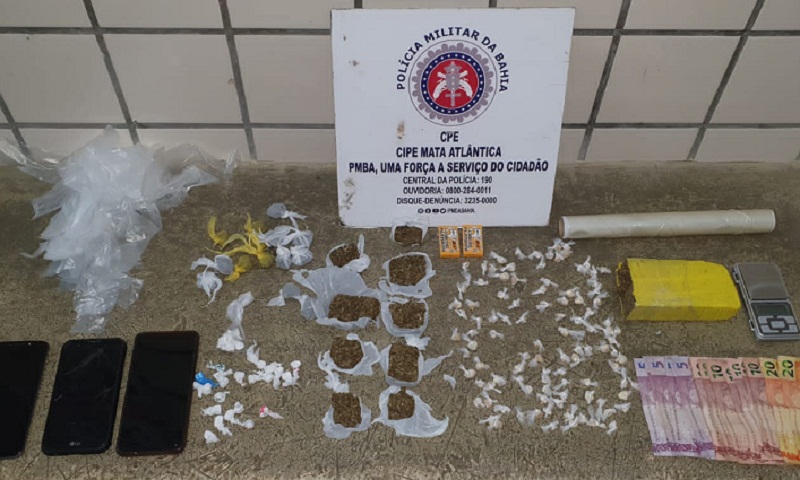 Os militares apreenderam 01 tablete de maconha, pesando 295 gramas; 23 (vinte e três) buchas de maconha, pesando 205 gramas; 102 (cento e duas) pedras de crack; 26 (vinte e seis) pinos de cocaína; 01 balança de precisão; 01 celular marca LG, 01 celular marca Motorola, 01 celular marca- Xiaomi; 02 caixas de Gillette, e dezenas de embalagens plásticas.