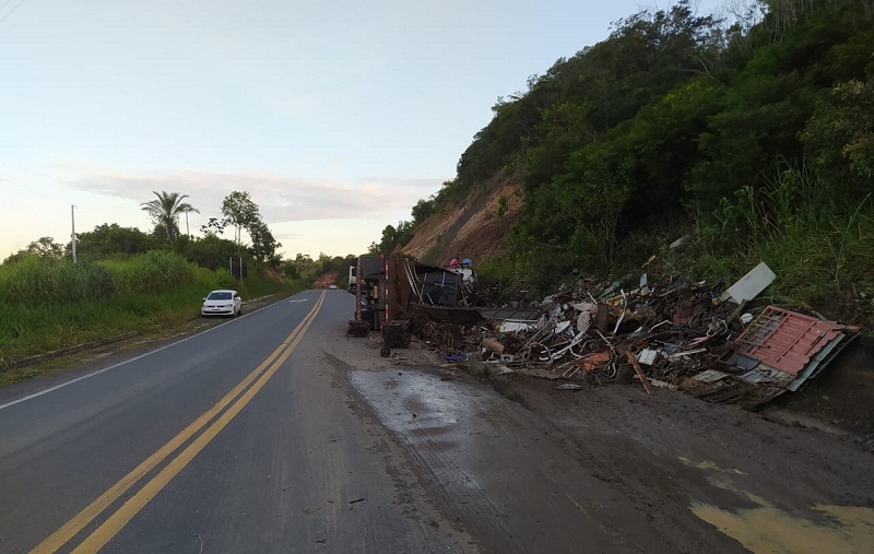 O acidente seguido de tombamento aconteceu na manhã da última terça-feira, 15 de março, por volta das 17h30, no KM 895, local conhecido como Curva da Tarifa, na BR-101, em área do município de Caravelas. Informações colhidas no local dão conta de ffque o motorista Josenildo Bonini Rocha, de 45 anos, trafegava na via, conduzindo um veículo Scania/R450, placa RQP-2A84 (Mercosul) carregado de sucata, quando perdeu o controle da direção e tombou.