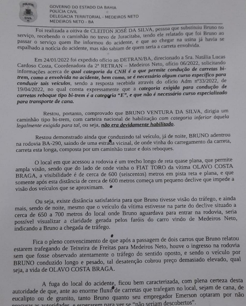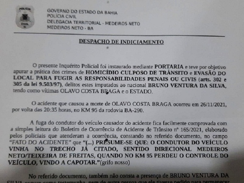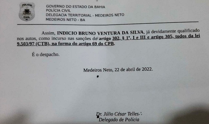 Nossa equipe de reportagem apurou ainda, que no decorrer das investigações, ficou evidente pela Polícia Civil de Medeiros Neto, por meio do delegado titular, Julio Telles, que houve imperícia e imprudência por parte do motorista do Bi-trem no momento do acidente. Diante de todos os fatos, o delegado Júlio César Telles, indiciou o Bruno Ventura da Silva, pelo crime de Homicídio Culposo e fuga de local de acidente (Art. 302, § 1º, I e III e Art. 305, todos da Lei 9.503/97 (CTB), na forma do Artigo 69 do CPB.