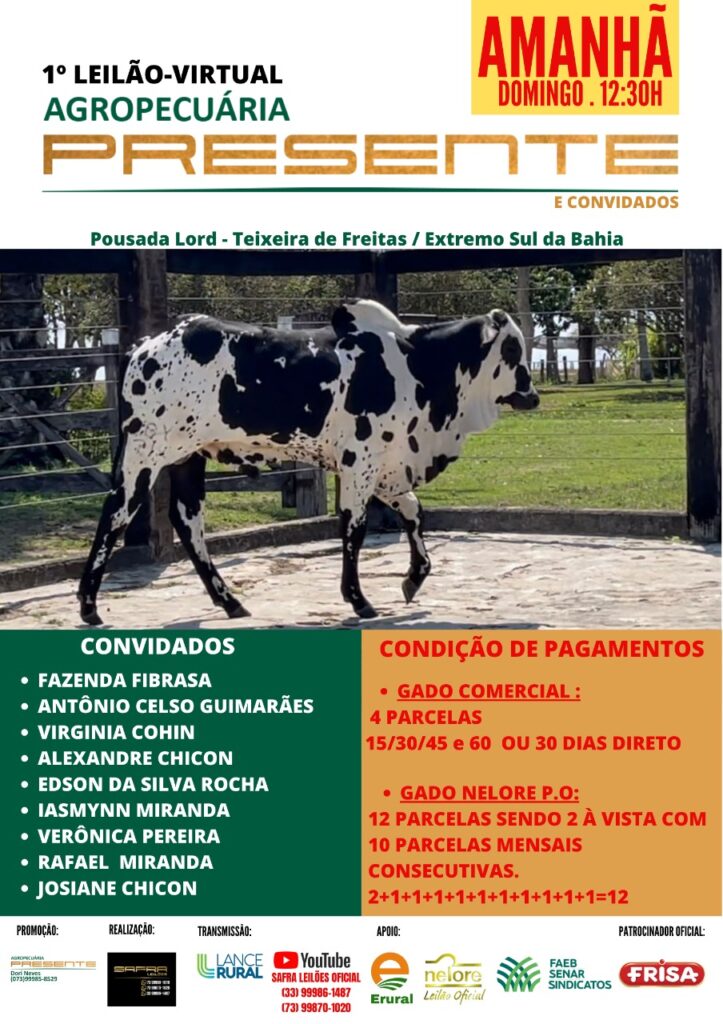 Transmitido pelo canal do YOUTUBE da SAFRA LEILÕES OFICIAL, o 1º Leilão da Agropecuária Presente, acontece neste domingo, 12 de setembro na Pousada Lord, em Teixeira de Freitas, no extremo sul da Bahia.