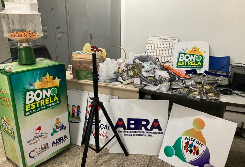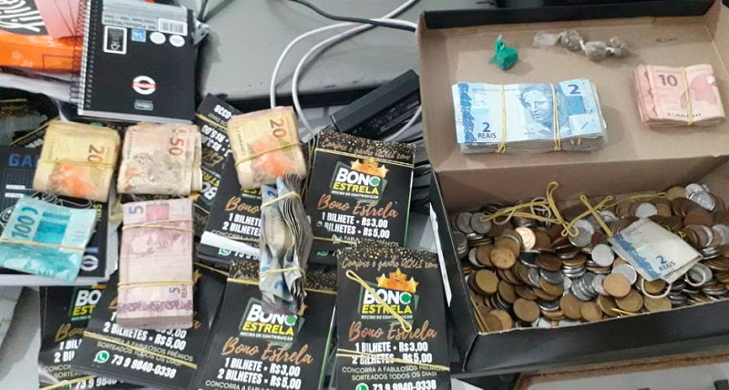 Após diligências e informações precisas, a equipe chegou aos suspeitos. No local, denominado como sendo “Bono Estrela” recibo de contribuição, foi encontrado, cartelas, equipamentos para sorteios, placas de entidades beneficentes, equipamentos de escritório, 02 (dois) megafones, 01 notebook HP, 01 mouse, 01 tripé e a quantia entre espécie e moedas de R$ 4.875, (quatro mil oitocentos e setenta e cinco reais), valores provenientes do “Bono Estrela” (Jogo Irregular)