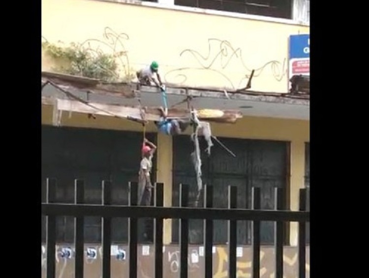 Dois operários ficaram pendurados pelo cinto de proteção em uma obra do prédio onde funcionava o Instituto do Cacau, no bairro do Comércio, em Salvador. O caso aconteceu na manhã desta quinta-feira (4) e as vítimas foram resgatadas pelos colegas de trabalho e com ajuda de um ônibus.