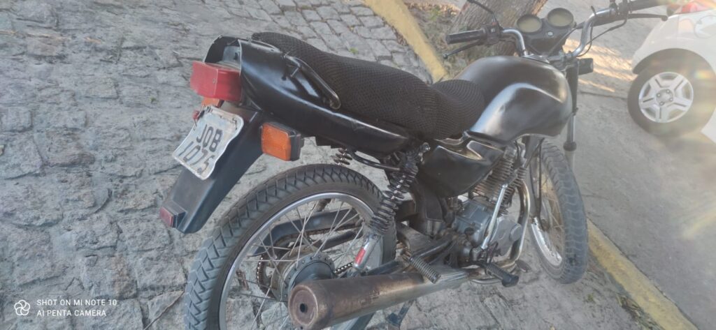 A PM encontrou a moto Honda 125 Titan, cor preta, placa JOB-1075, na Rua Itajubá, no Bairro Luís Eduardo Magalhães, na residência de Rony Silva Rocha, de 29 anos.