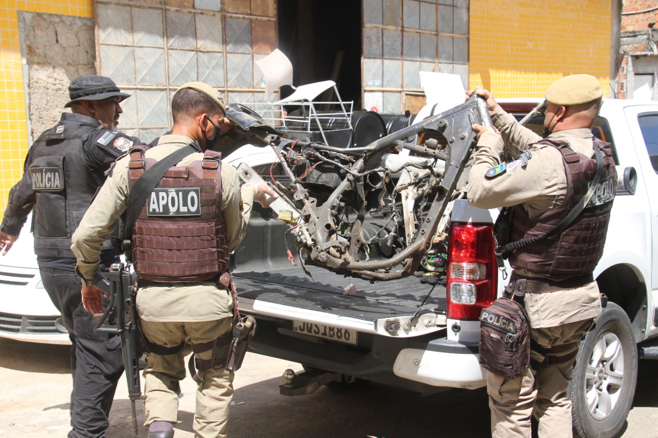 Sete carcaças de motocicletas, dois motores de veículos, dezenas de baterias, ferramentas para desmontagem de peças, acessórios veiculares, além de uma motocicleta com restrição de roubo e outra com o número do chassi divergente da indicada no veículo foram apreendidas na manhã desta sexta-feira (8), durante a Operação Combate a Furtos e Roubos de Veículos, em Salvador. Os materiais foram encontrados em estabelecimentos nos bairros de Sussuarana e Pau da Lima.