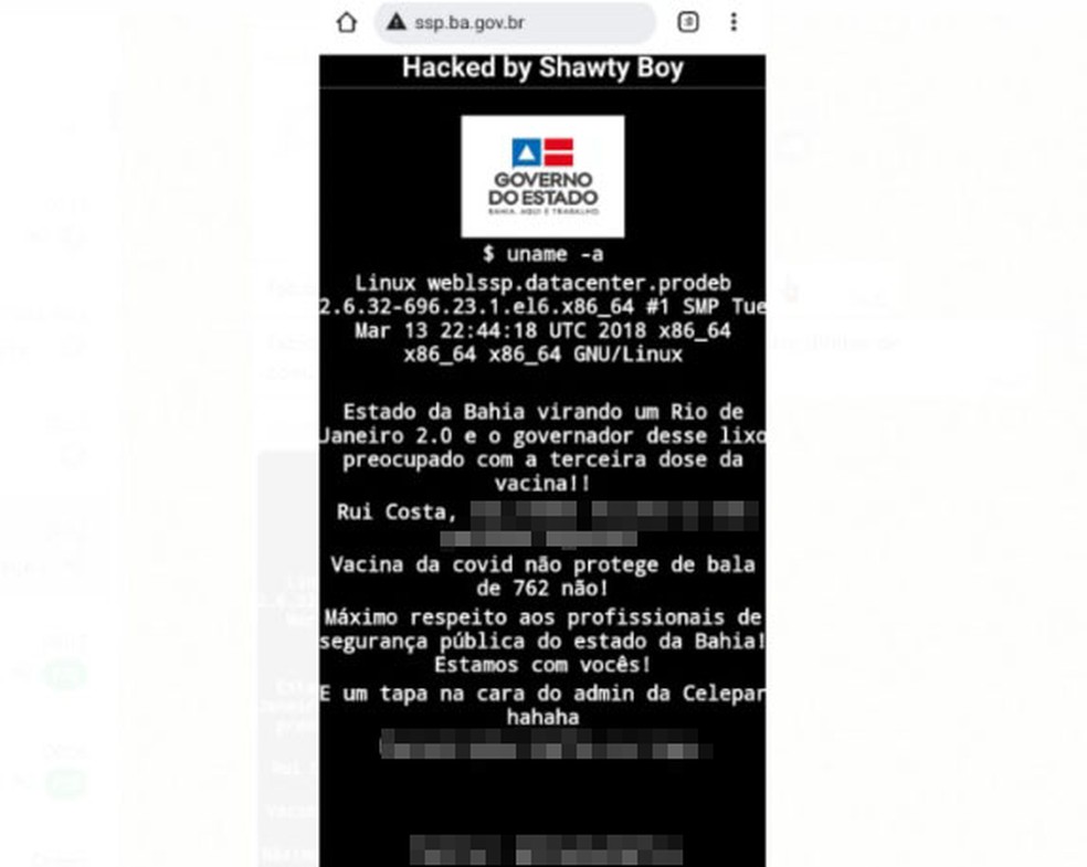 Durante a madrugada, o acesso ao portal exibia uma mensagem que comparava a violência na Bahia ao Rio de Janeiro, além de insultos ao governador Rui Costa e à vacina. Também na publicação, o grupo hacker afirmou ter “máximo respeito aos profissionais de segurança pública”.