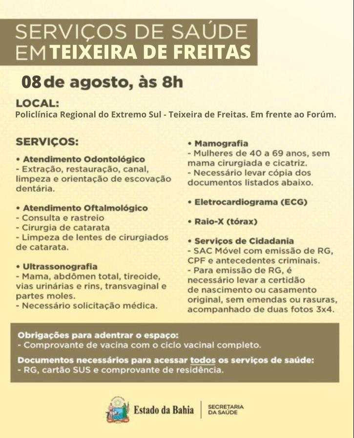 Teixeira de Freitas terá Feira de saúde entre os dias 08 e 09 de agosto na Policlínica
