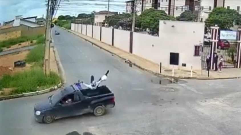 Um motorista foi atropelado e caiu dentro da carroceria de um carro, na Avenida Laura Nunes, em Vitória da Conquista, no sudoeste da Bahia. O acidente foi registrado por câmeras de segurança da região.